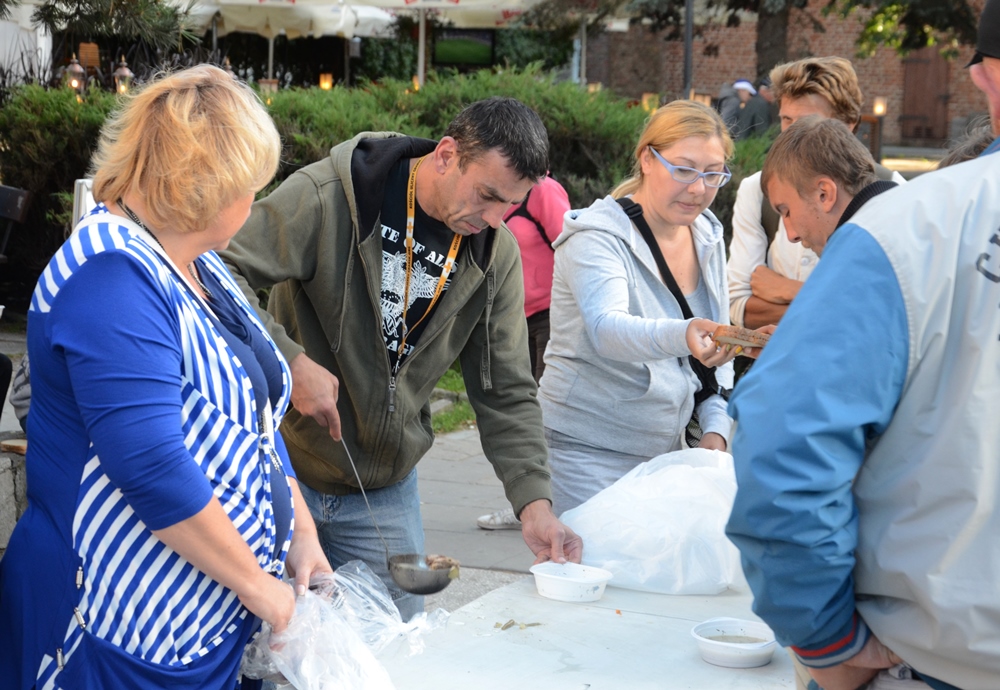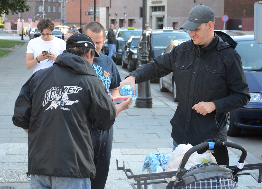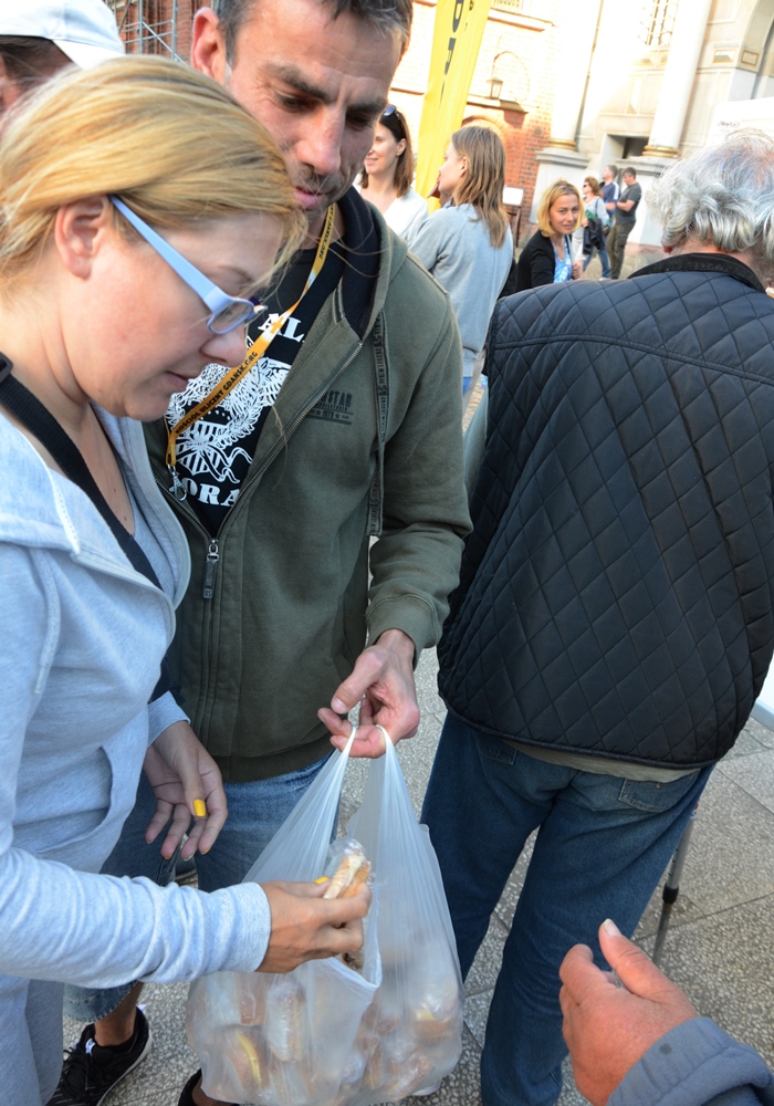 Mariusz i Marina przynoszą kilkadziesiąt kanapek, które sami zrobili w domu. Poświęcili dużo czasu, aby je przygotować. Tym większa jest ich radość, gdy widzą ludzi, którzy z apetytem je jedzą.