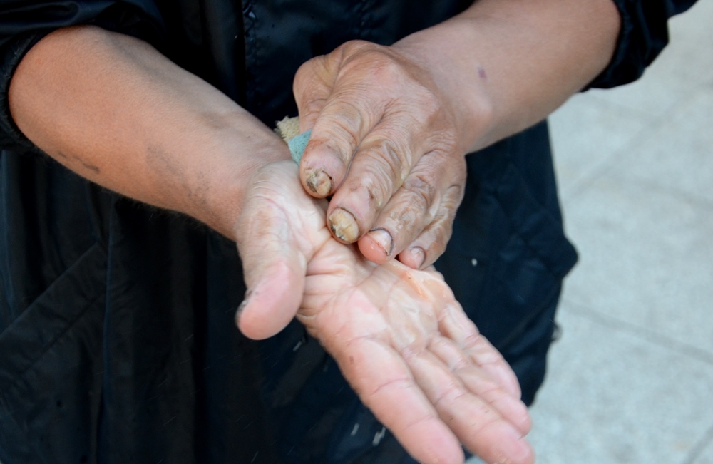Pewien bezdomny mężczyzna ma bardzo brudne ręce. Kupujemy obcinarkę do paznokci. Myjemy mu ręce i buzię, aby zwiększyć jego szanse na skuteczne poruszanie się wśród normalnych ludzi. Cieszy się.