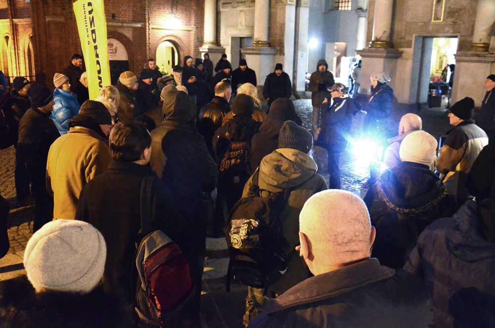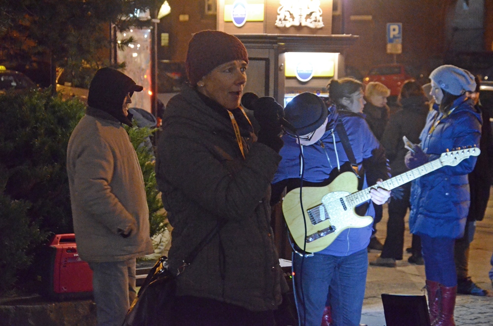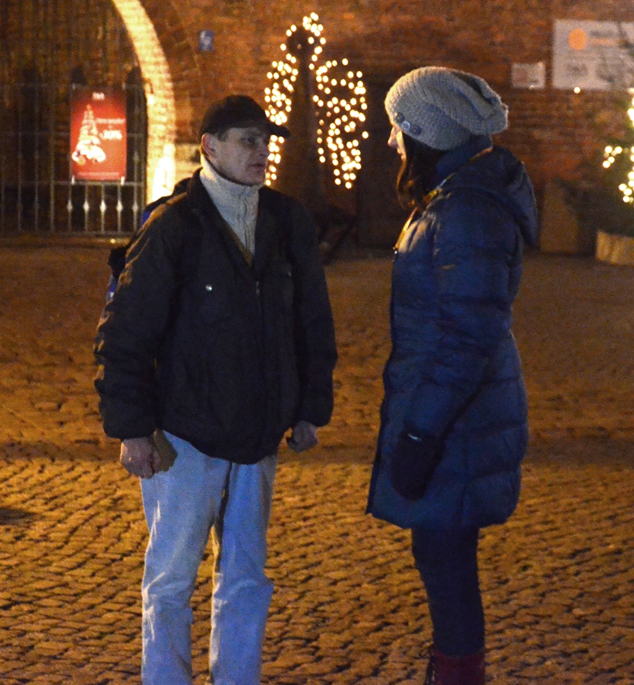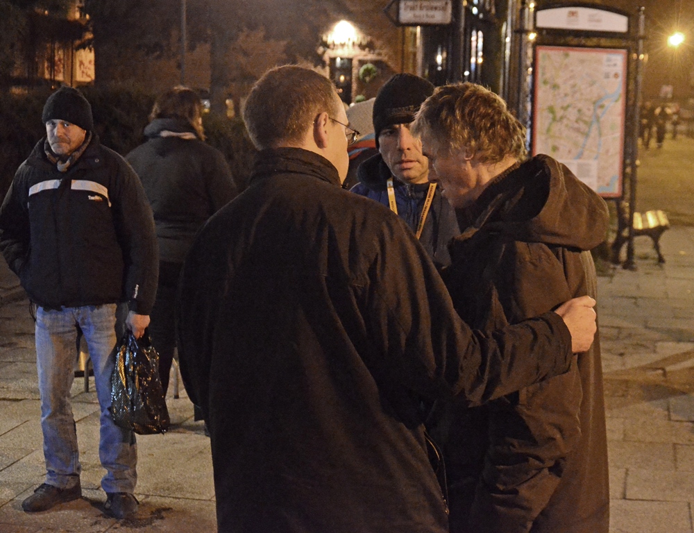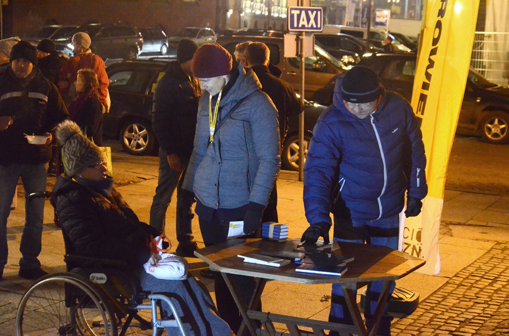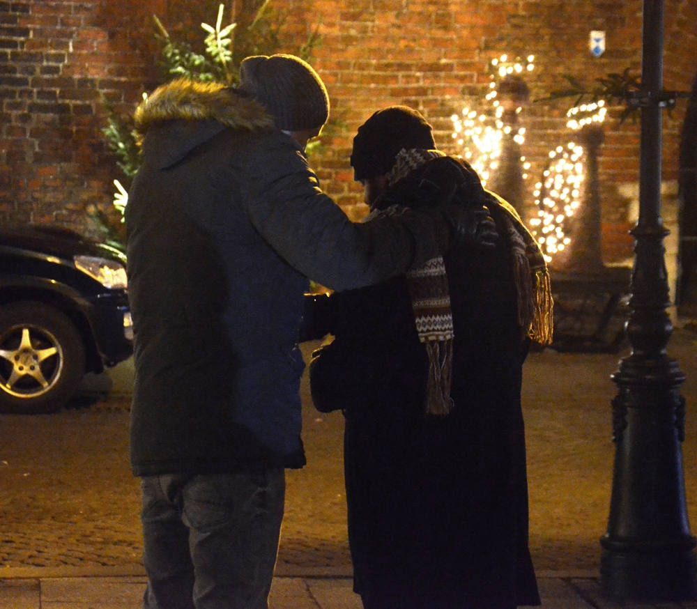 Ktoś składa nam życzenia świąteczne. Ktoś nas błogosławi. Robert opowiada przez mikrofon o solenizancie, którego urodziny będziemy obchodzić 25 grudnia. Osobom bezdomnym rozdajemy zupę, ubrania i zaproszenia na wigilię. Jest fantastycznie!