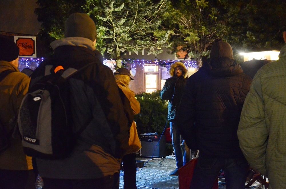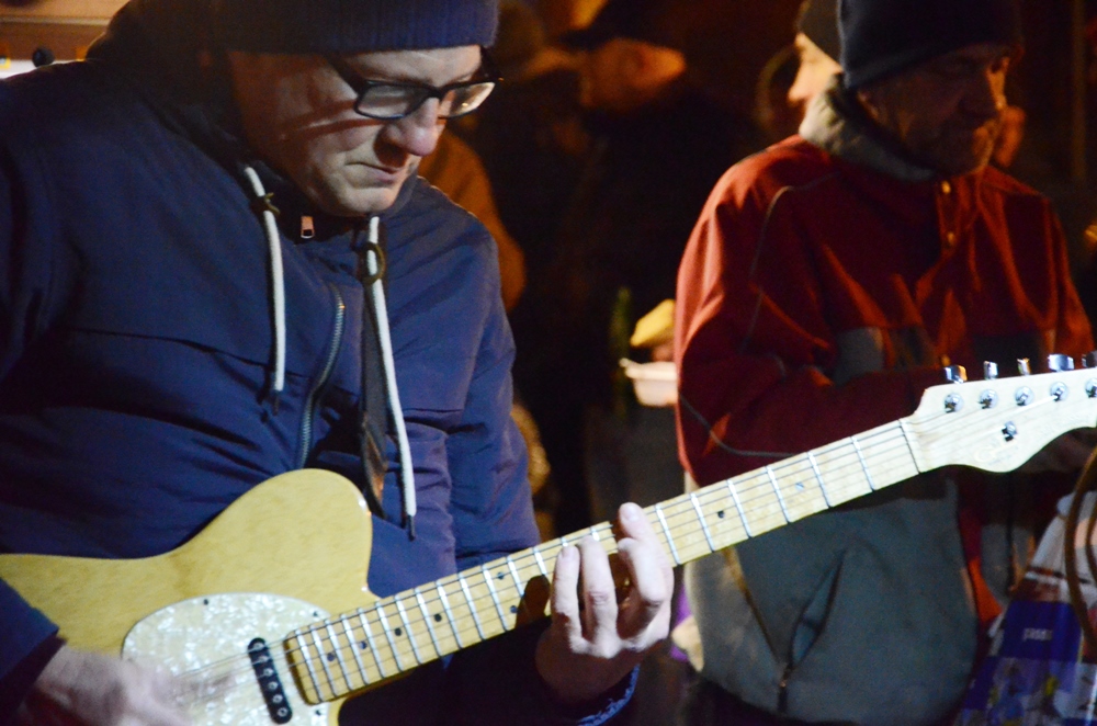 Jacek gra bluesa. Podziwiamy go, bo wszyscy mamy rękawiczki i jest nam zimną, a on przez godzinę gra bez i jest zadowolony.
