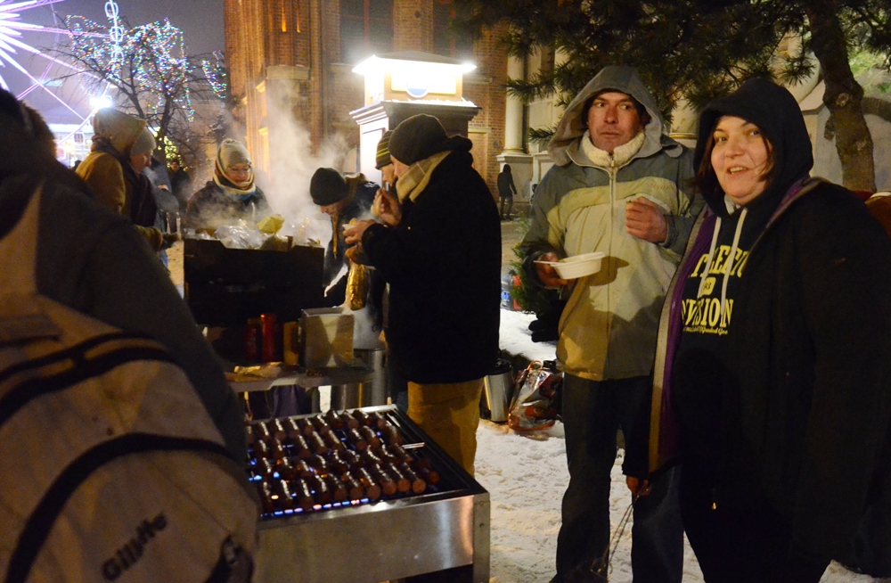 – 8C. Część osób przychodzi z gołymi głowami. Jeszcze nie wiemy jakie ubrania będziemy dzisiaj mieli do rozdania. Póki co Agnieszka idzie do sklepu i kupuje im czapki oraz rękawiczki.
