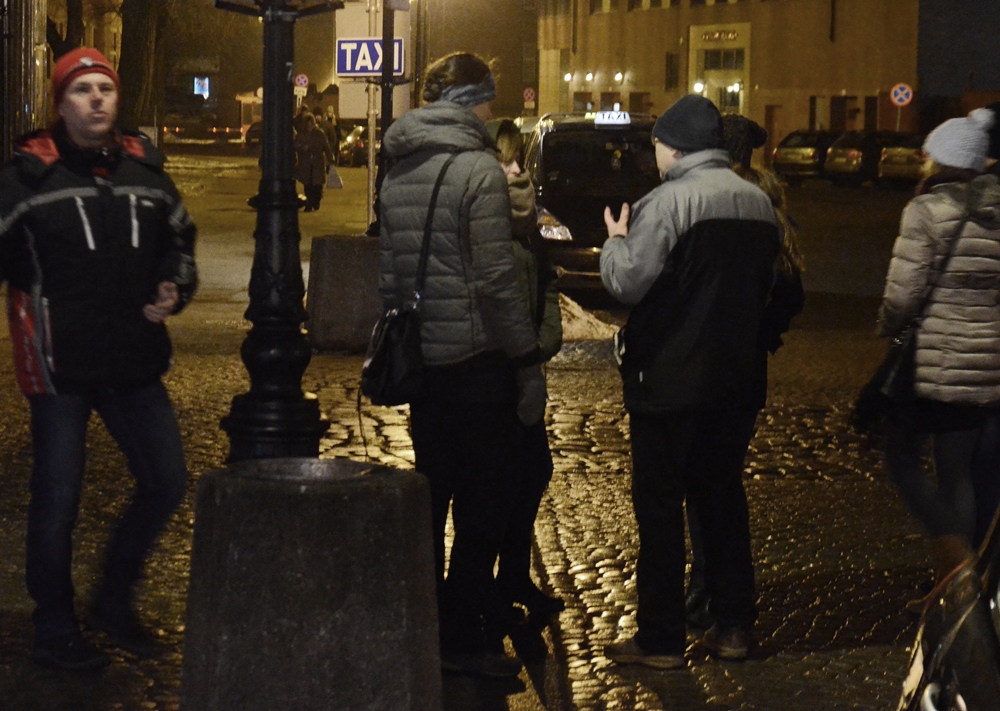 Bezdomny mężczyzna przepuszcza jakąś kobietę przodem i mówi: „Proszę bardzo! Mi się nie spieszy”.