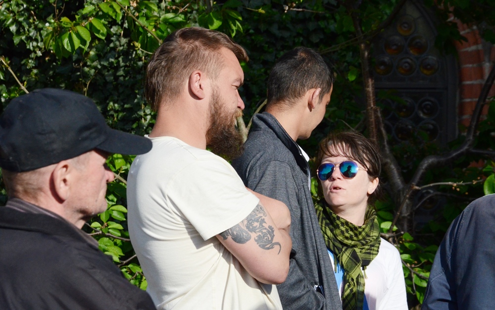 Pewien mężczyzna, który regularnie przychodzi na spotkania Kościoła Ulicznego, stoi na uboczu ze spuszczonym wzrokiem.