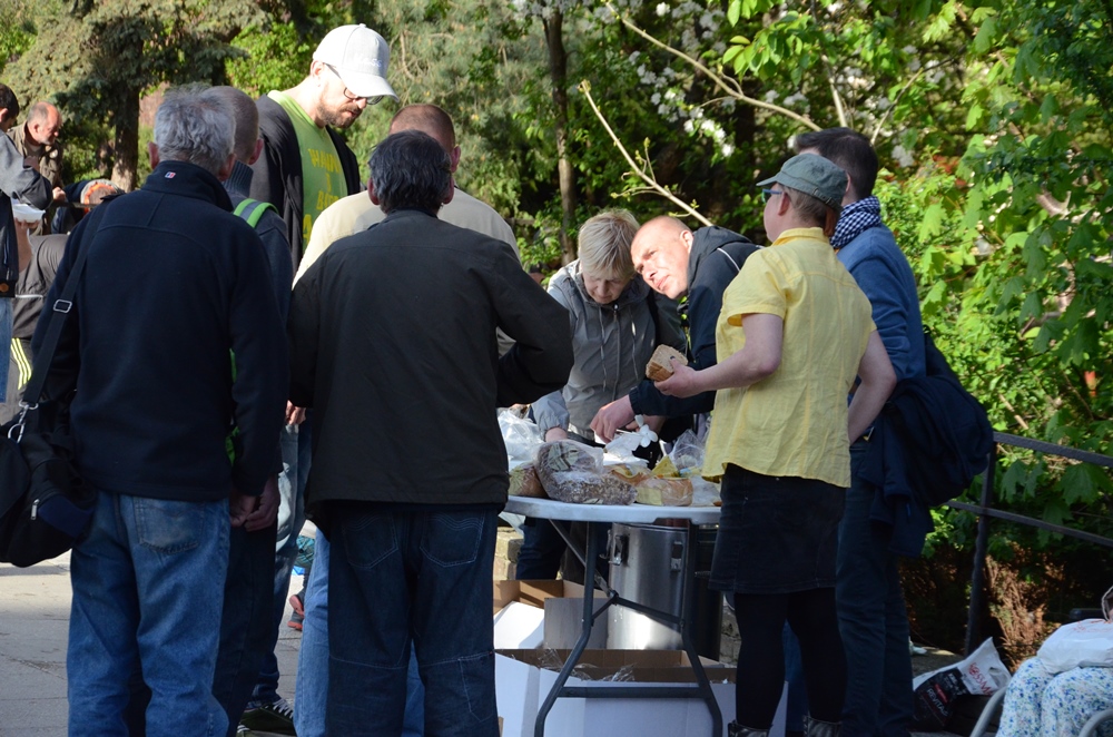 Przy stole z jedzeniem panuje duży ruch, pomimo że nie ma jeszcze zupy. Mariusz przywozi kanapki, które regularnie co tydzień robi ze swoją rodziną. Natychmiast znajdują się na nie chętni. Po chwili pojawia się druga siatka z kanapkami. Zrobiła je pani Jagoda, która słysząc o ludziach, którzy tutaj przychodzą postanowiła im jakoś pomóc. Dlatego zrobiła kanapki. Takie odruchy serca są niezwykle wzruszające. Wkrótce przywożą chleb z zaprzyjaźnionej piekarni i zupę z zaprzyjaźnionej restauracji.