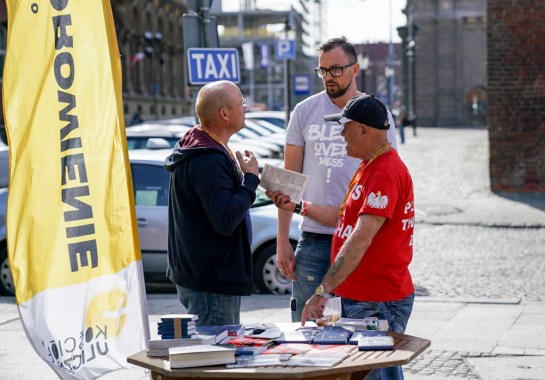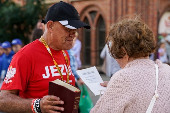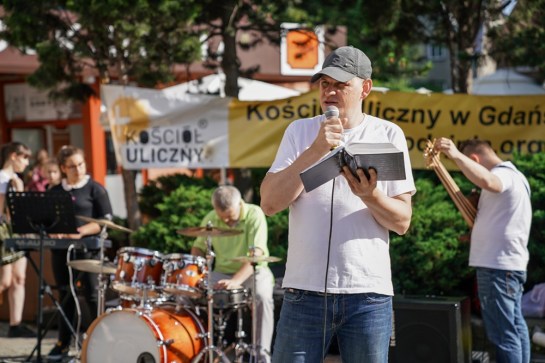 – Gdziekolwiek pojawił się Jezus Chrystus, tam podążał za nim wielki tłum ludzi, którzy się źle mieli i tych, którzy chcieli słuchać Jego nauczania. Jest nas dzisiaj tutaj bardzo wielu. Przychodzimy pod Złotą Bramę właśnie ze względu na imię Jezusa Chrystusa. Występujemy jako Jego uczniowie, którym zlecił zadanie zaniesienia światła ewangelii. Przychodzimy tutaj w każdy wtorek, aby prezentować Jego Słowo, dzięki któremu wielu ludzi odnajduje sens życia, a wielu innych jest uzdrawianych. Uczestnictwo w tej misji to nasz przywilej, obowiązek i radość. Niech dobry Bóg błogosławi dzisiaj wszystkich zebranych – głosimy przez mikrofon. Przemawia Ela, Iwona, Agata, Beti, Zenek, Maciek, Krzysiek, Jacek i Wojtek.