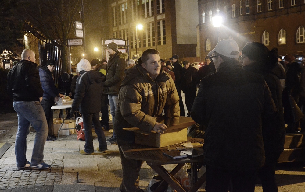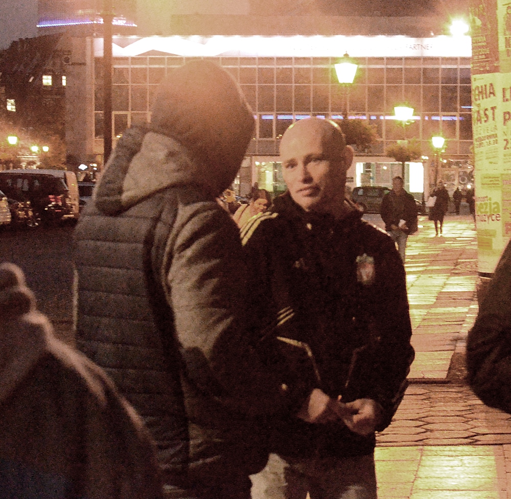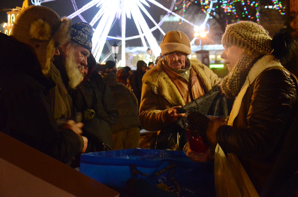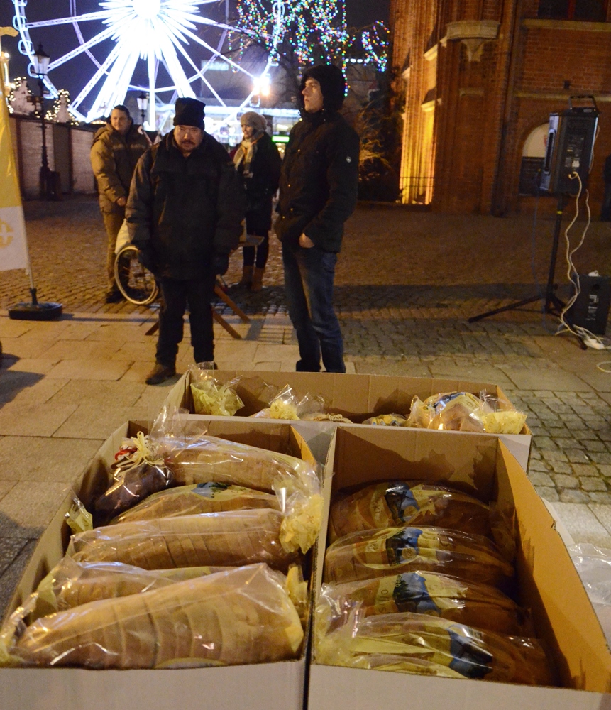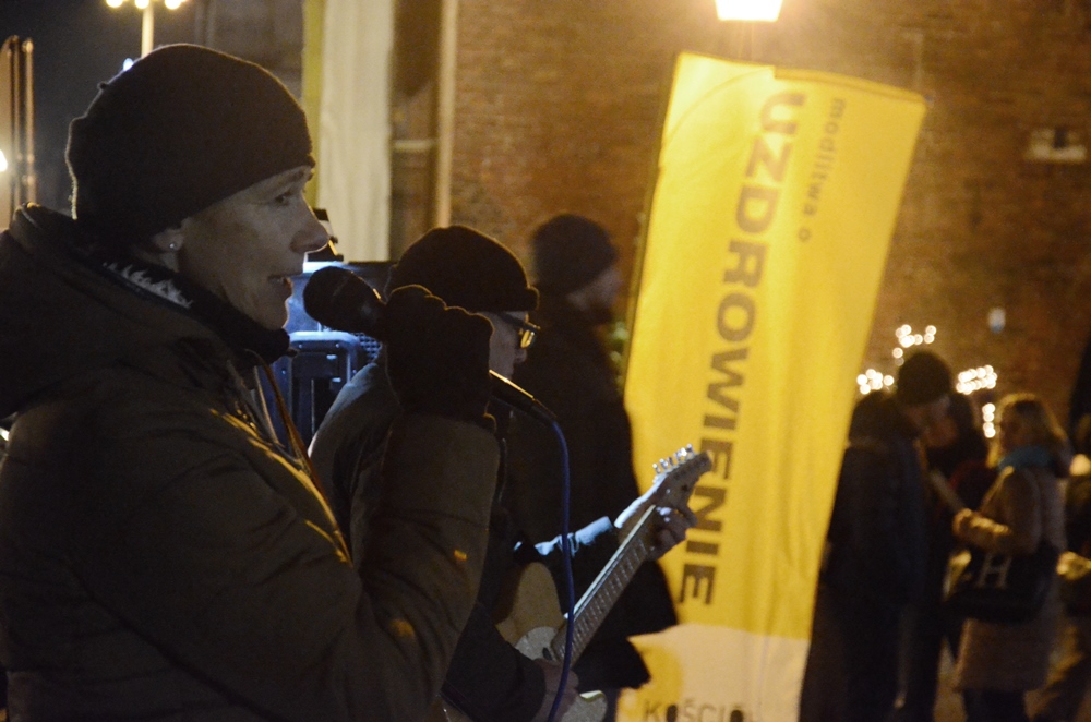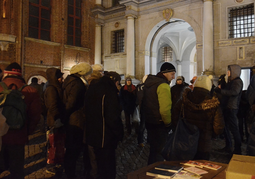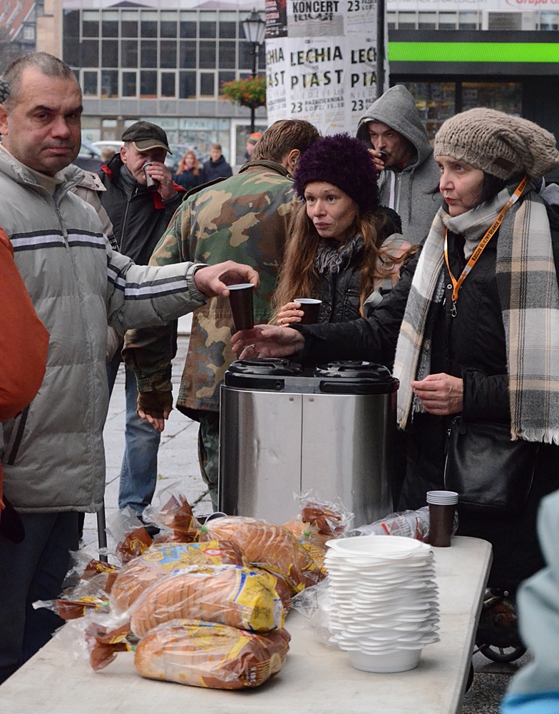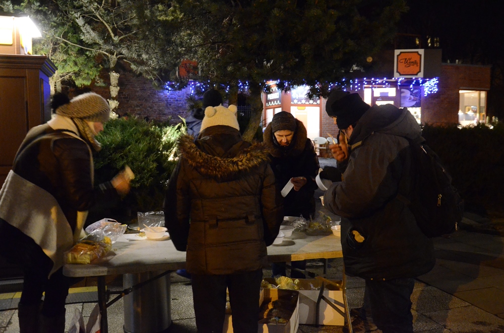 Dzisiejsze spotkanie odbywa się pomiędzy jarmarkiem bożonarodzeniowym, radiowozami, a uczestnikami manifestacji KOD. W powietrzu odczuwa się napięcie. My jednak jesteśmy zaangażowani jedynie w głoszenie Królestwa Bożego i pomoc drugiemu człowiekowi. Przemawiamy, modlimy się, rozdajemy zupę, ubrania, czapki i szaliki. Jacek gra na gitarze bluesa dla Pana Boga.