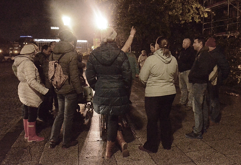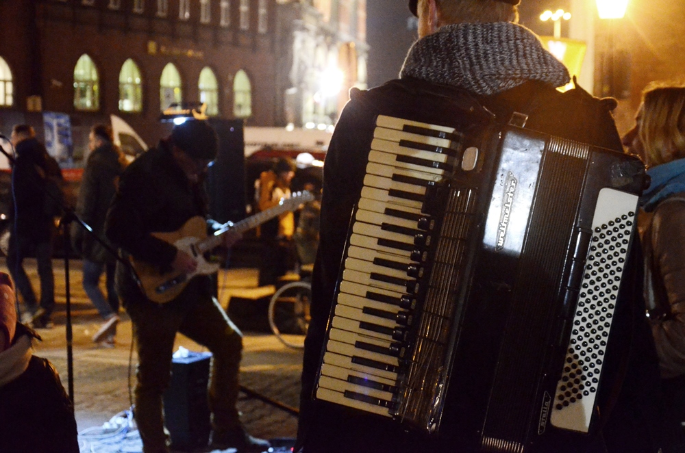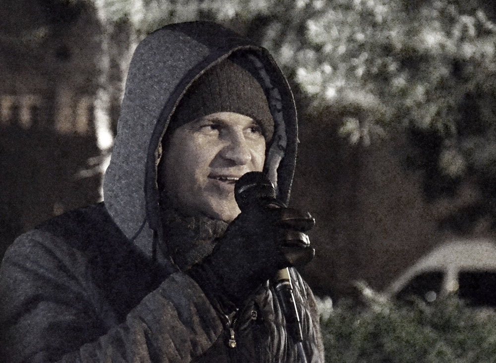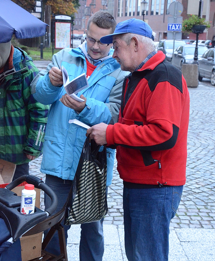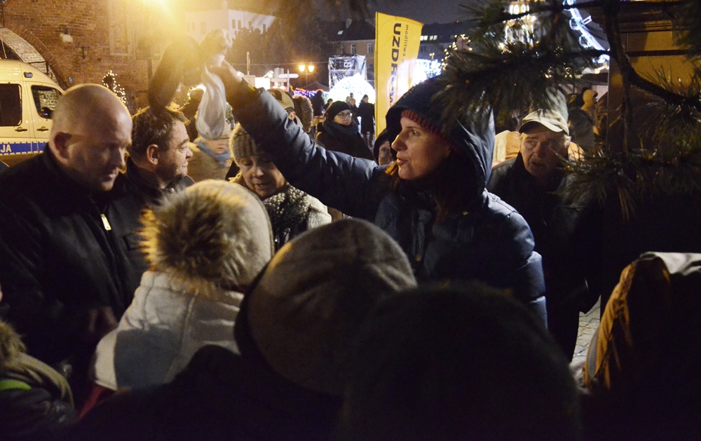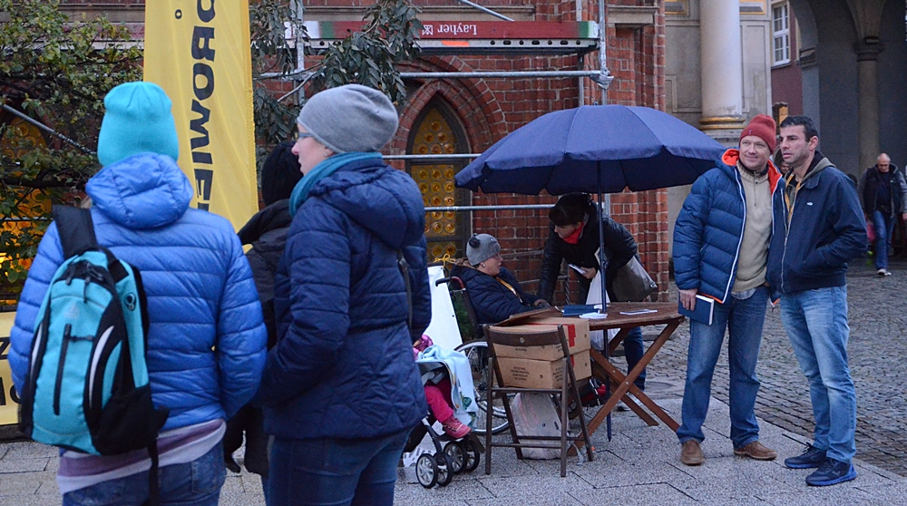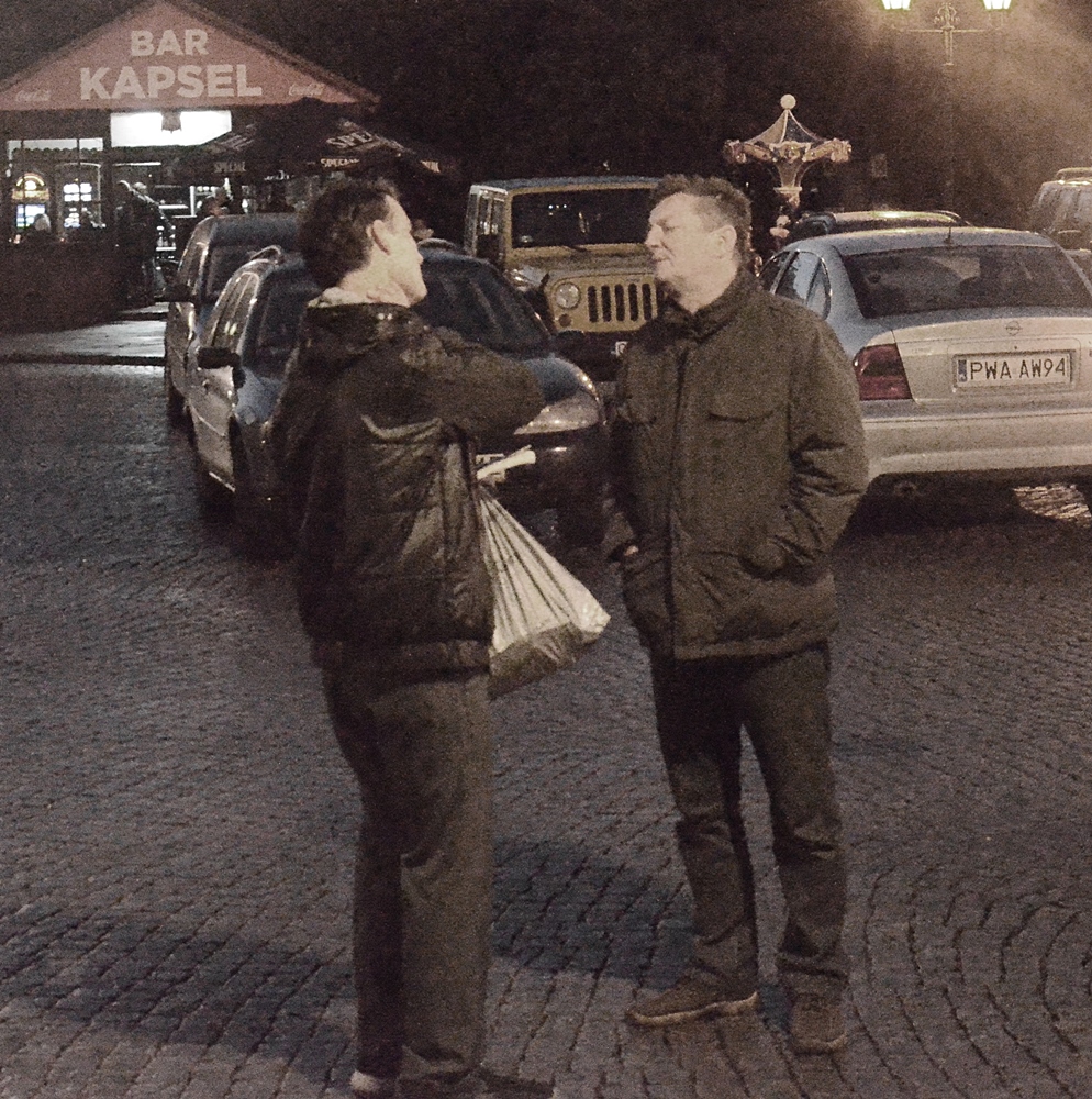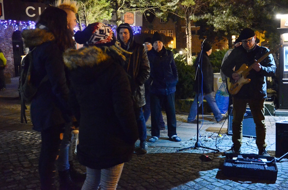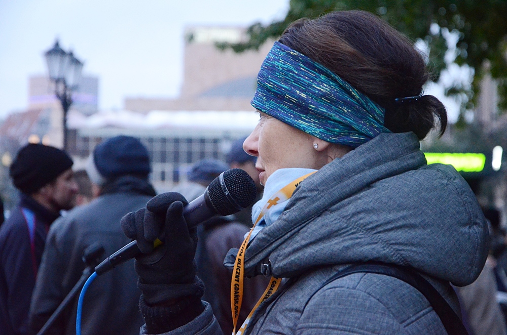 Dzisiejsze spotkanie odbywa się pomiędzy jarmarkiem bożonarodzeniowym, radiowozami, a uczestnikami manifestacji KOD. W powietrzu odczuwa się napięcie. My jednak jesteśmy zaangażowani jedynie w głoszenie Królestwa Bożego i pomoc drugiemu człowiekowi. Przemawiamy, modlimy się, rozdajemy zupę, ubrania, czapki i szaliki. Jacek gra na gitarze bluesa dla Pana Boga.