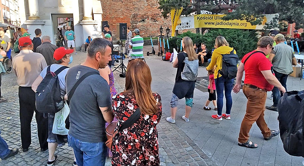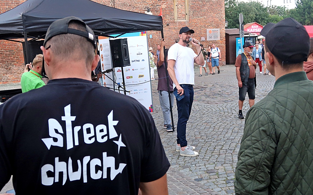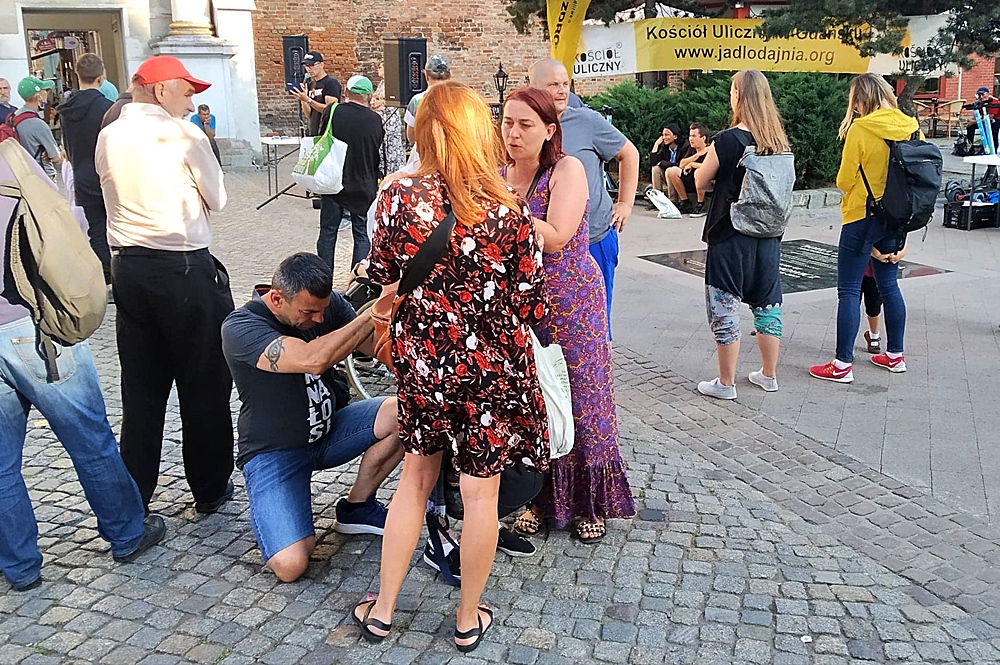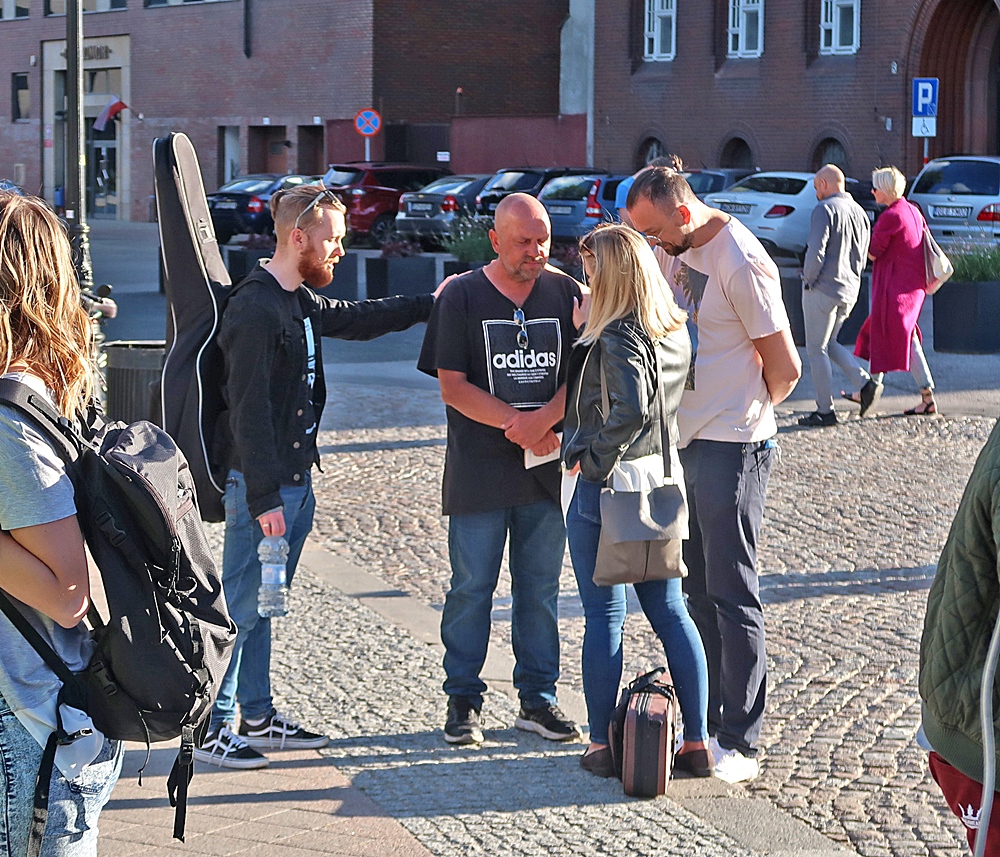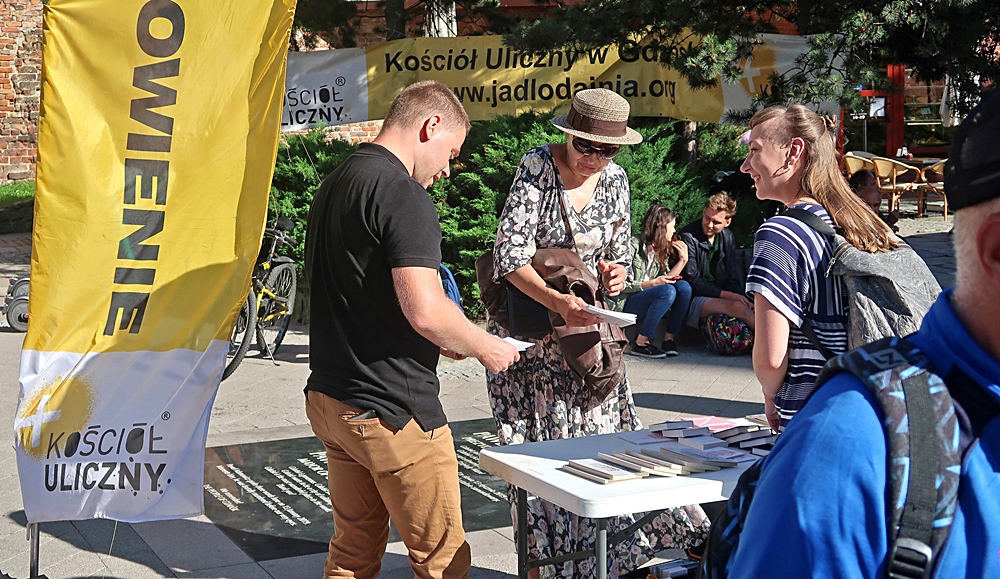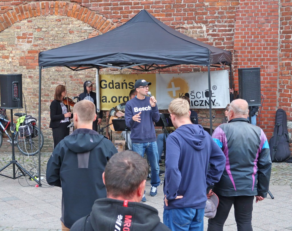 „«Mężowie ateńscy – przemówił Paweł stanąwszy w środku Areopagu widzę, że jesteście pod każdym względem bardzo religijni. Przechodząc bowiem i oglądając wasze świętości jedną po drugiej, znalazłem też ołtarz z napisem: „Nieznanemu Bogu”. Ja wam głoszę to, co czcicie, nie znając. Bóg, który stworzył świat i wszystko na nim, On, który jest Panem nieba i ziemi, nie mieszka w świątyniach zbudowanych ręką ludzką i nie odbiera posługi z rąk ludzkich, jak gdyby czegoś potrzebował, bo sam daje wszystkim życie i oddech, i wszystko.” Tak samo działo się podczas ostatniego spotkania Kościoła Ulicznego w Gdańsku. Piotr stanął na murku i zaczął swą przemowę. Było jakoś głucho i pusto. W takich warunkach głos niósł się daleko a zebrani wokół ludzie przysłuchiwali się z większą uwagą. Choć nie mieliśmy namiotu, ani nagłośnienia, nasza obecność spowodowała trwałe zmiany w sercach wielu osób. Usłyszeliśmy decyzję pójścia za Bogiem, którego głosimy. Jeden z obecnych zadawał pytania dotyczące chrztu jako osoby dorosłej. Inni wychwalali Jezusa za otrzymany pokarm. Spotkanie pełne było Bożej chwały. I choć w kilku momentach diabeł próbował zabrać nam pokój, to jednak wzmocnieni przez wiarę odnieśliśmy zwycięstwo zachowując miłość, radość, pokój, cierpliwość, uprzejmość, dobroć. Duch Święty działał i to było spełnienie naszych modlitw.